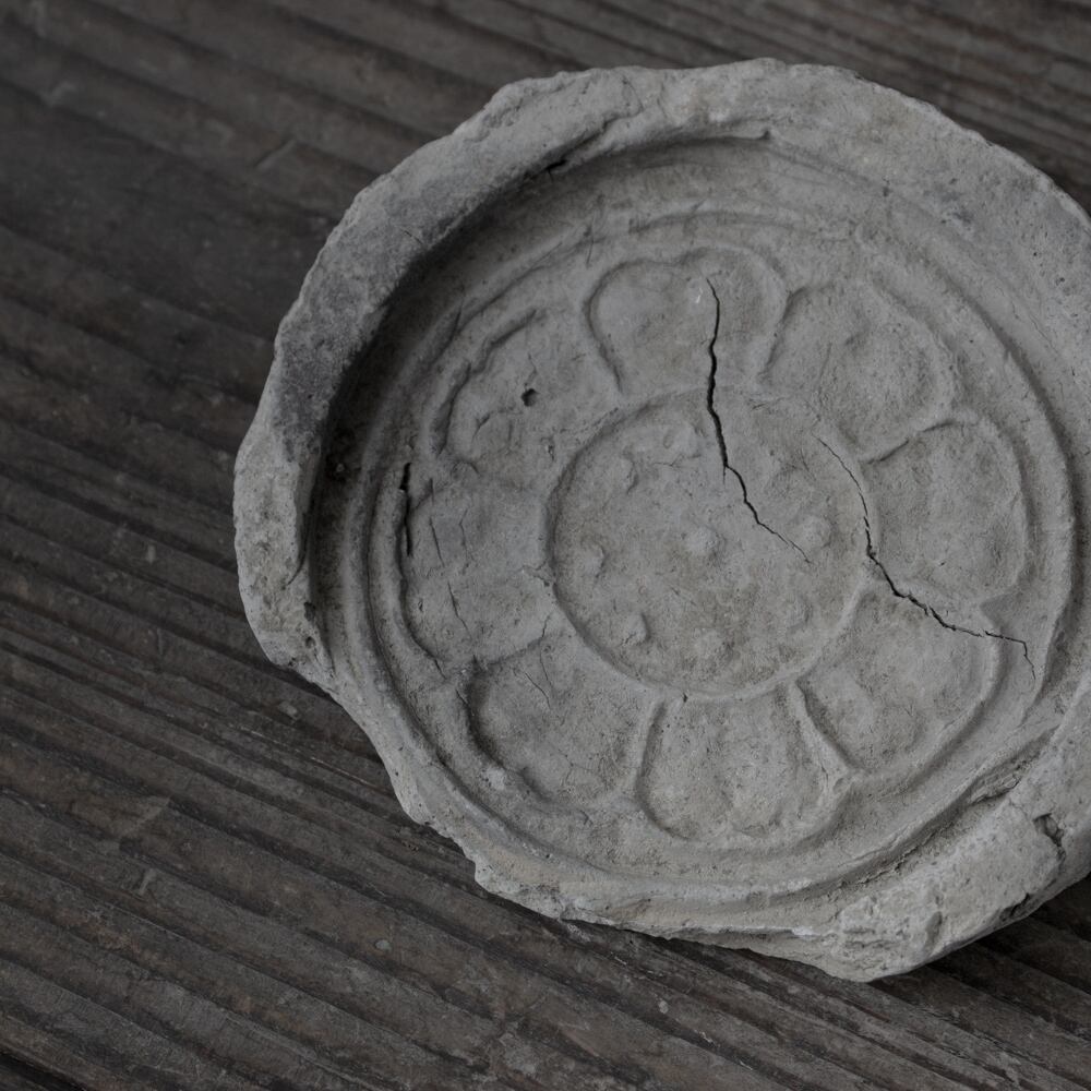 SOLD OUT 日本、奈良時代-平安時代 8世紀-12世紀。直径(一番幅のある箇所) 139mm 程の複弁蓮華文の軒丸瓦(鐙瓦)残欠。
